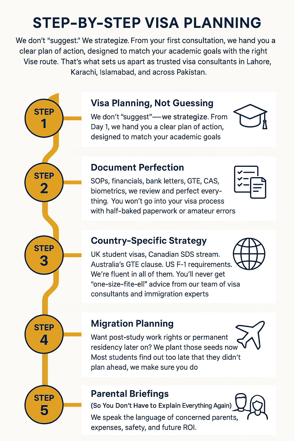 At GradLink, we don’t leave anything to chance. We’re study abroad consultants and immigration experts who’ve guided hundreds of Pakistani students, just like you, from confusion to visa approval with a proven, battle-tested process.